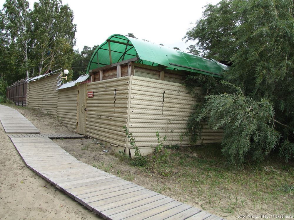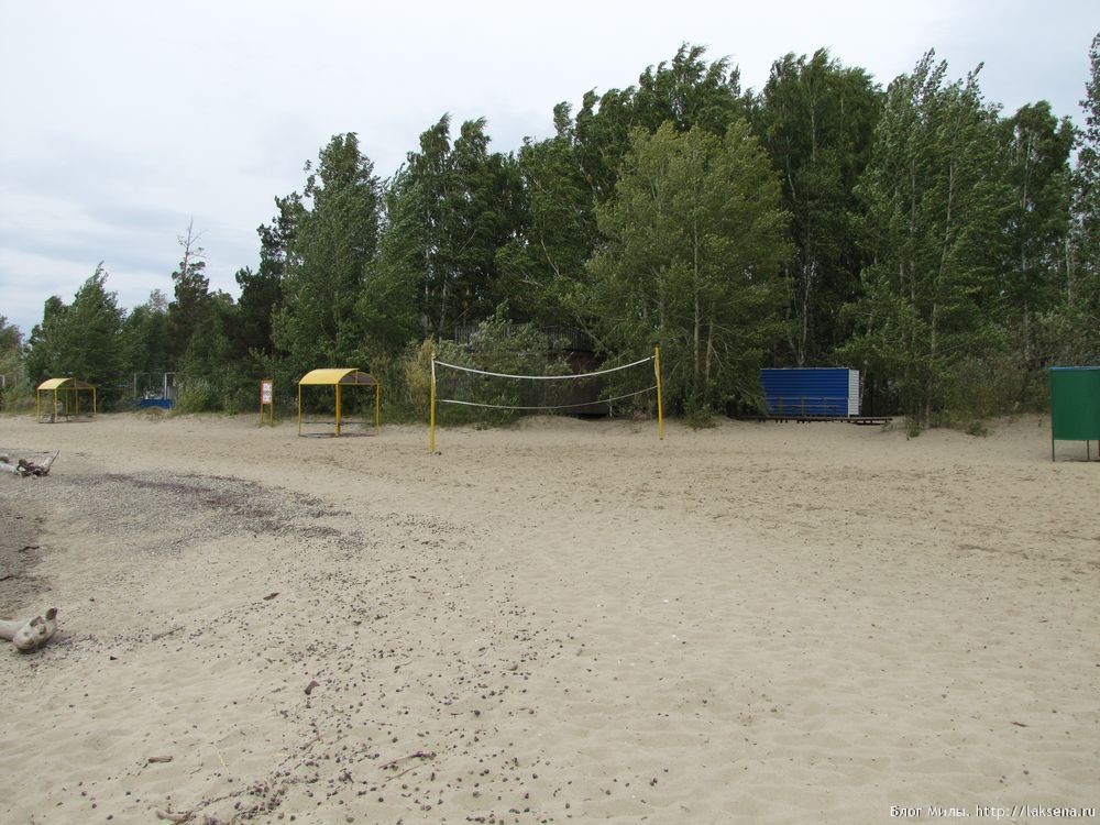 Широкий пляж находился в сосновом лесу, причем, часть леса, прилегающая к арендованной площадке, была совсем небольшая, ограниченная парковкой, спортивными площадками и забором (так что не было опасности, что дети в лесу потеряются).