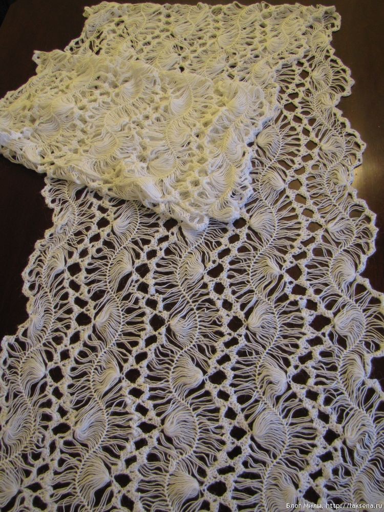 Про пряжу хочется отметить, что в этом палантине шикарно смотрится ее небольшая пушистость. Но эта же пушистость очень затрудняет распускание изделия, если что-то вдруг пошло не так.