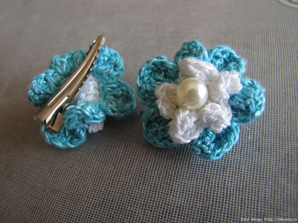 Использовала пряжу “Мальва” ПНК им. Кирова (50% хлопок, 50% вискоза, 350м/75гр), крючок 2,0, бусины в виде жемчужин, заготовки для заколки-крокодил, клей-пистолет.