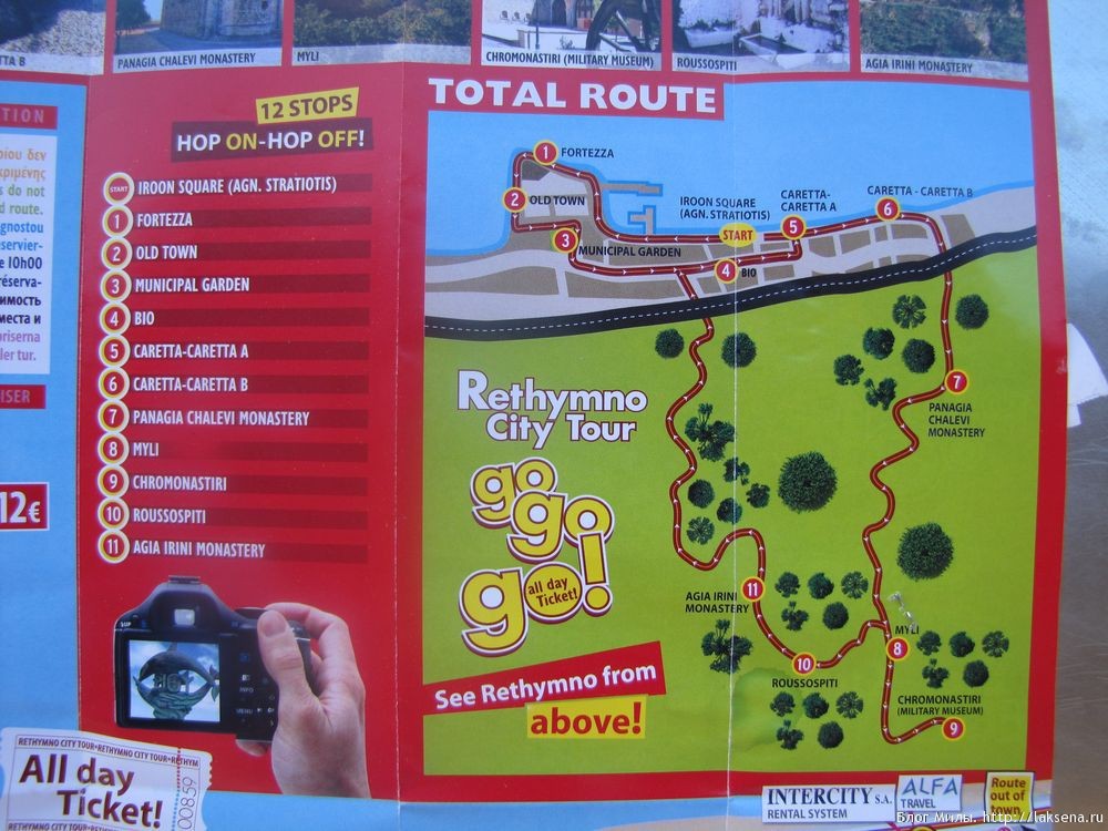 Как и на любом подобном маршруте, у автобуса есть остановки, на которых можно сходить, осматривать окрестности, а затем ехать дальше на следующем автобусе. Билет действителен в течение дня и стоит 12 евро для взрослого, 6 евро на ребенка 6-12 лет, маленькие дети бесплатно. В автобусе есть аудиогид и на русском языке.