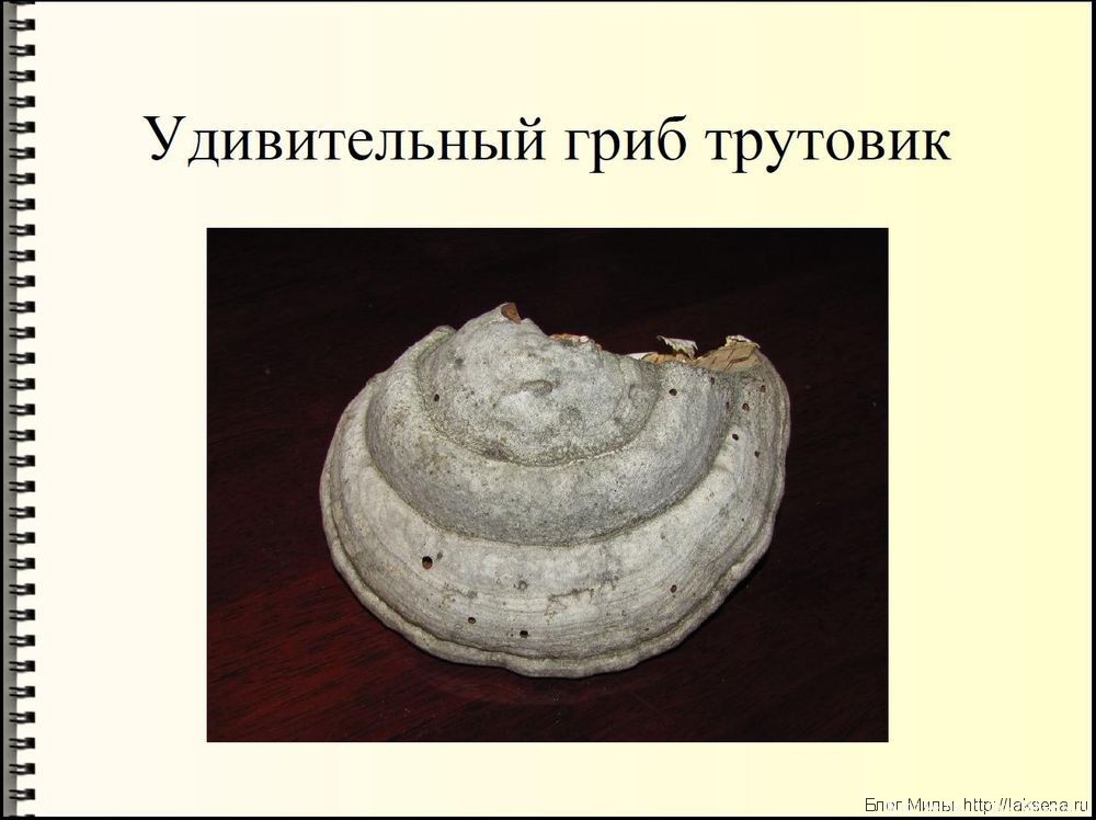 Презентацию желательно было сделать в электронном виде, поэтому делали в программе Open Office Impress (можно сформировать презентацию как в формате этой программы, так и в формате PDF). Сфотографировали гриб, добавили на обложку презентации. Еще была фотография у дерева, пораженного трутовиком – добавили и эту фотографию как иллюстрацию, как растет гриб трутовик.