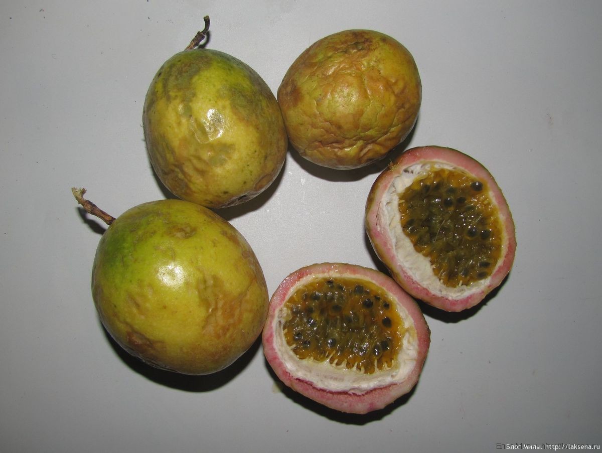 Маракуйя (Passiflora edulis), также известна как гренадилла пурпурная, а её латинское наименование породило более интересные названия: пассифлора, страстоцвет, плоды страсти и пешенфрут.
