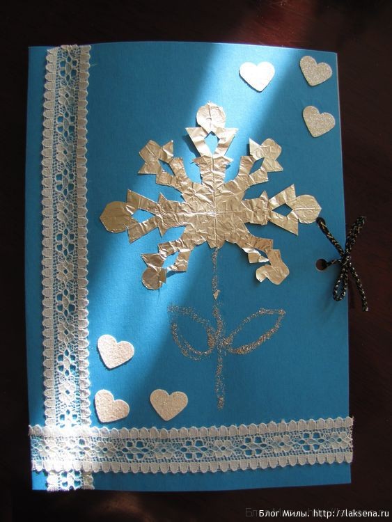 картон голубого цвета, полоски белого кружева, белая бумага с блестками, фольга, оформительский клей с блестками, специальный дырокол сердечком, фольга, клей.