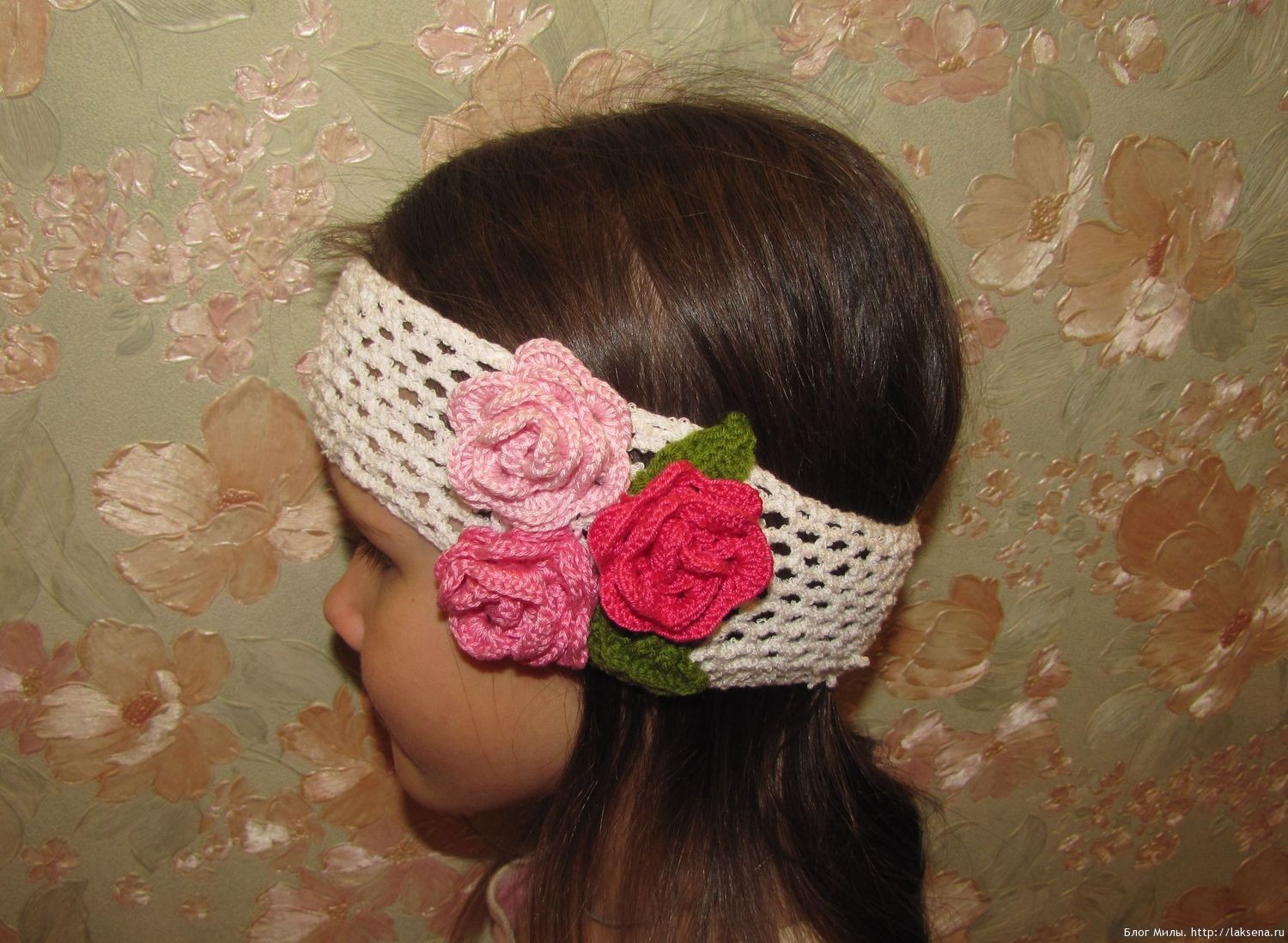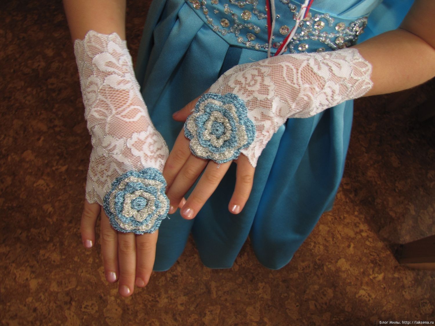 Цветы связаны из пряжи двух цветов. Голубой цвет идентичен цвету платья, серебристый перекликается с расшитым поясом. Такое украшение издалека напоминает и перстень.