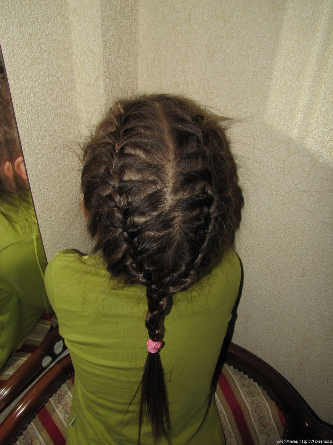 Волосы делятся на косой пробор (от точки над левым ухом до точки под правым ухом. Нижние волосы закрепляются, на верхних плетется французская коса, переходящая в простую трехпрядную косу. Затем на нижних волосах плетется такая же французская коса. Две косы соединяются внизу и закрепляются общей резинкой для волос.