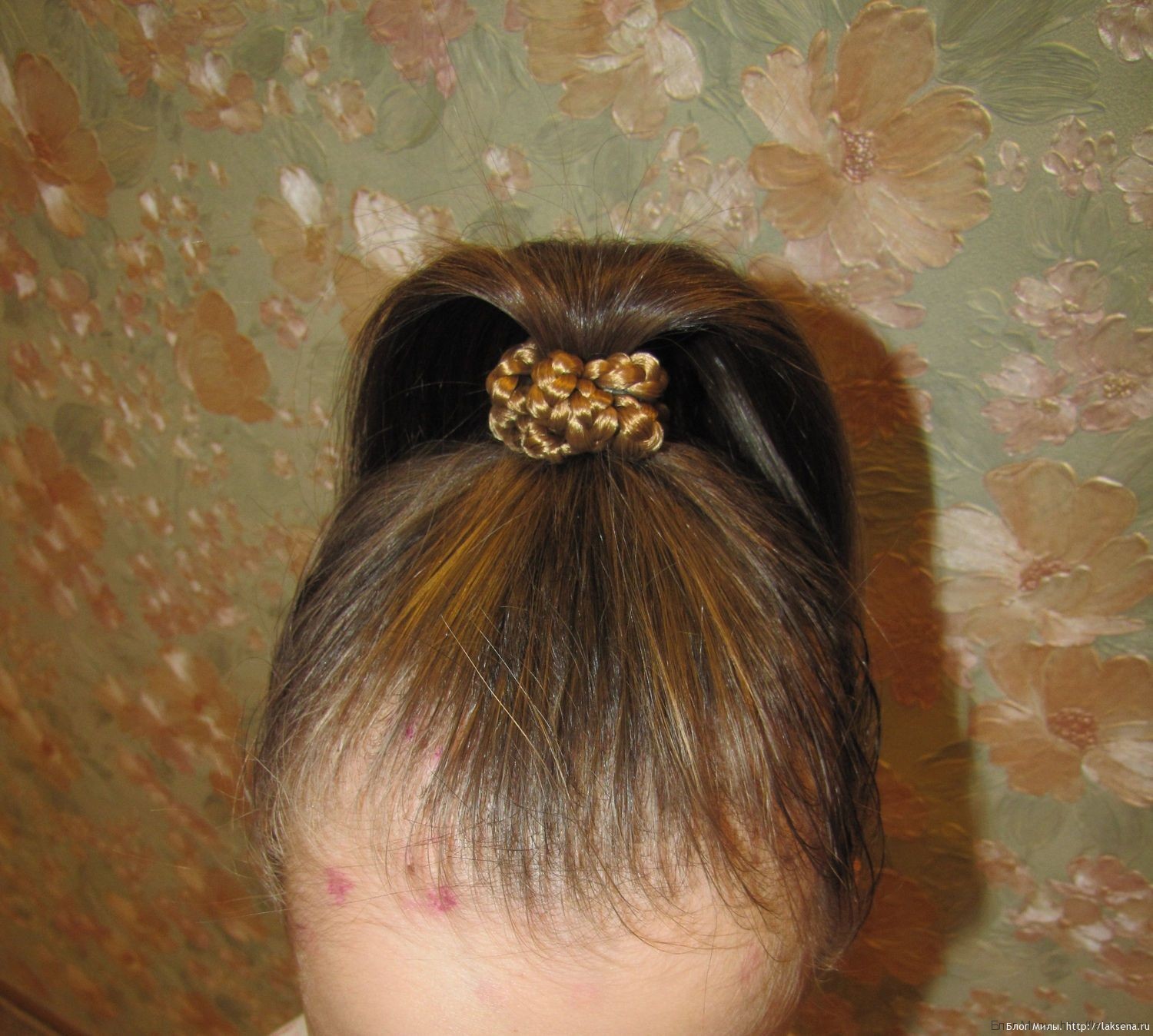 Волосы собраны в хвост на макушке, завязаны резинкой, обмотанной косичкой из искусственных волос. Волосы закручены на бигуди. Концы готовых локонов подколоты невидимками.