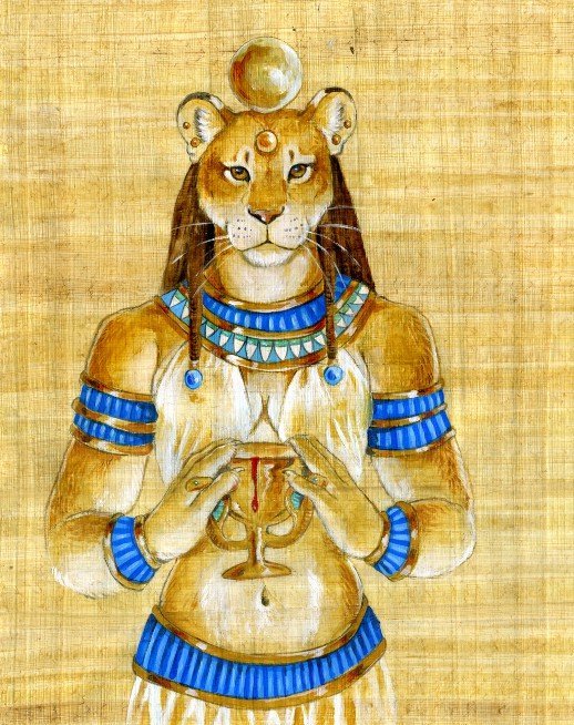 Сехмет («могучая») — богиня войны и палящего солнца, грозное око бога Солнца Ра, целительница, обладавшая магической силой напускать болезни и излечивать их, покровительствовала врачам, считавшимся её жрецами. Охраняла фараона. Обладала характером, не поддающимся контролю. Изображалась с головой льва, что вызывало её отождествление с Пахт, Тефнут и Баст. Была олицетворением солнечного зноя и разрушительной энергии Солнца, почему на голове её изображался диск. Как богиня жара, Сехмет представлялась весьма суровой. В позднем мифе об истреблении богом Ра непокорного человечества Сехмет (в других вариантах мифа — Хатхор, Тефнут, Баст) в качестве ока Ра наслаждалась избиением людей, и только пролитое на землю богами красное вино, на которое Сехмет набросилась, приняв за кровь, и от которого опьянела, заставило её прекратить резню. Сехмет считалась истребительницей врагов богов. В период Среднего царства фараоны в качестве защитников Египта от врагов часто сравнивались с Сехмет; поэтому богиня иногда изображалась с горящими стрелами. Некоторые версии мифа о сотворении человечества называют её создательницей ливийцев и азиатов. Носила эпитет «могучая» или «могущественная». Носила имена «Великая» и «Владычица пустыни». Была хранительницей мира и защитницей людей. К ней обращались в минуты опасности. Считалось, что её гнев приносил мор и эпидемии и, когда в Египте разразилась эпидемия чумы, фараон Аменхотеп III приказал изготовить семьсот статуй богини, чтобы умилостивить разгневанных богов. Богине поклонялись в храме Гелиополиса, где жрецы держали священных львов. Также храмы воздвигались на краю пустыни, где бродили дикие львы.