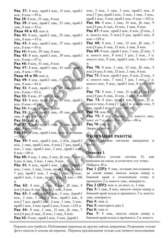 Плотность вязания: 18 п. и 28 р. = 10 см, плат. вязкой, спицами 5.5 мм.