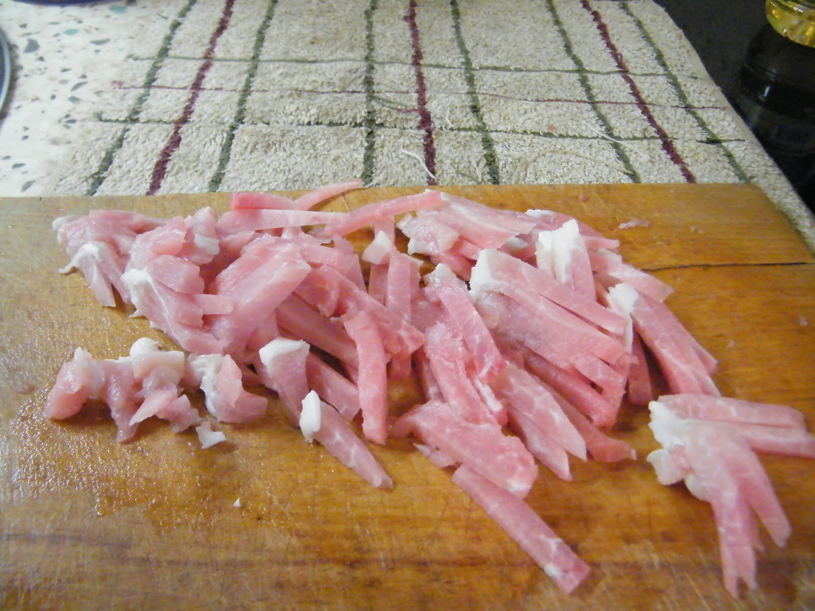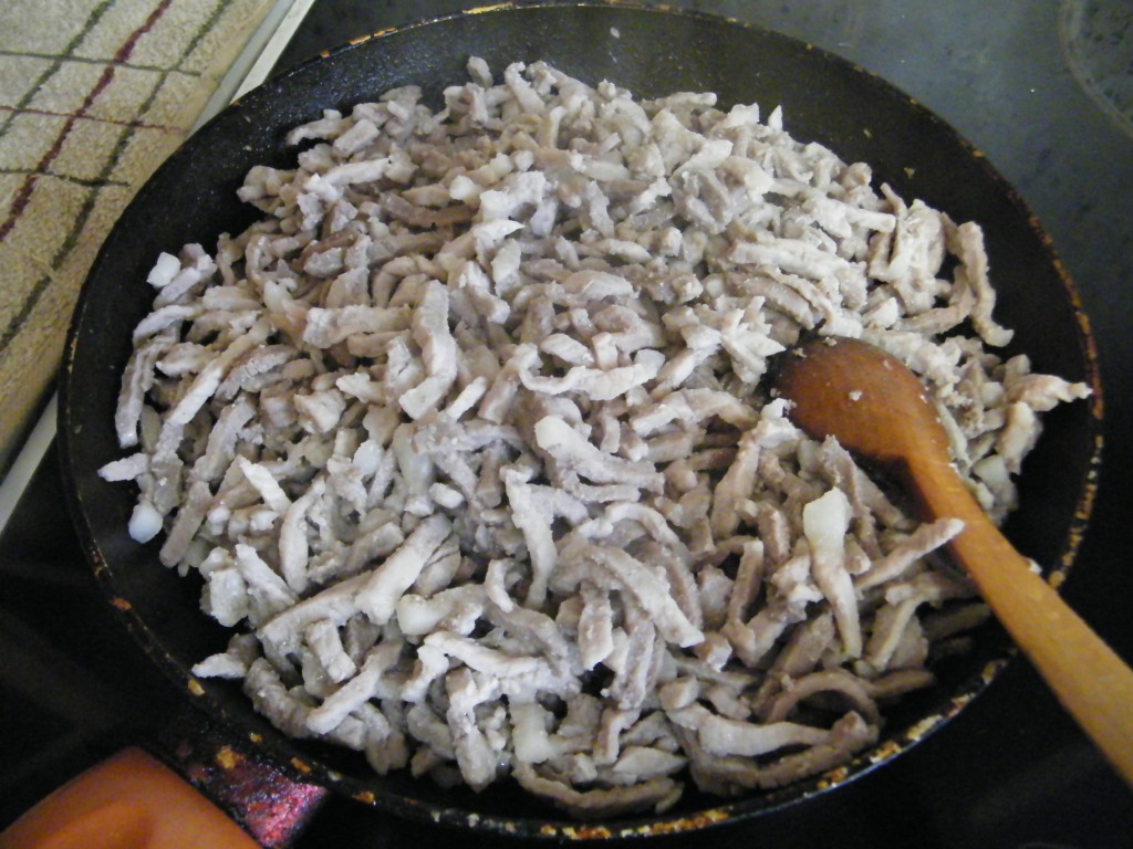 Мясо слегка размораживаю и нарезаю тонкой соломкой (сильно размороженное сложно тонко нарезать)