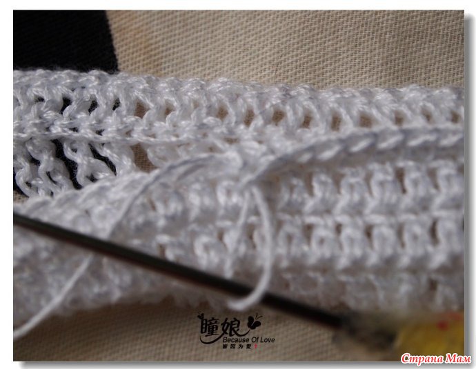 Когда диаметр круга достигнет 14ти сантиметров, продолжайте вязать без прибавлений еще 8 см. (размер шапочки будет зависеть от размера головы вышего малыша, вяжите сообтественно!). Далее связать еще три круговых ряда, в каждом из которых убывать по три петли. Обвязать край шапочки “рачьим шагом“.