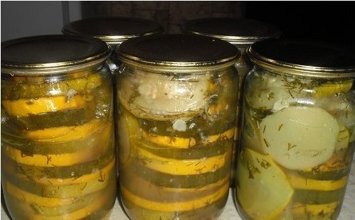 Разложить по стерильным банкам,залить соком,который образовался после того,как кабачки постояли 3 часа. Стерилизовать 10-15 минут и закатать простерилизованными крышками.