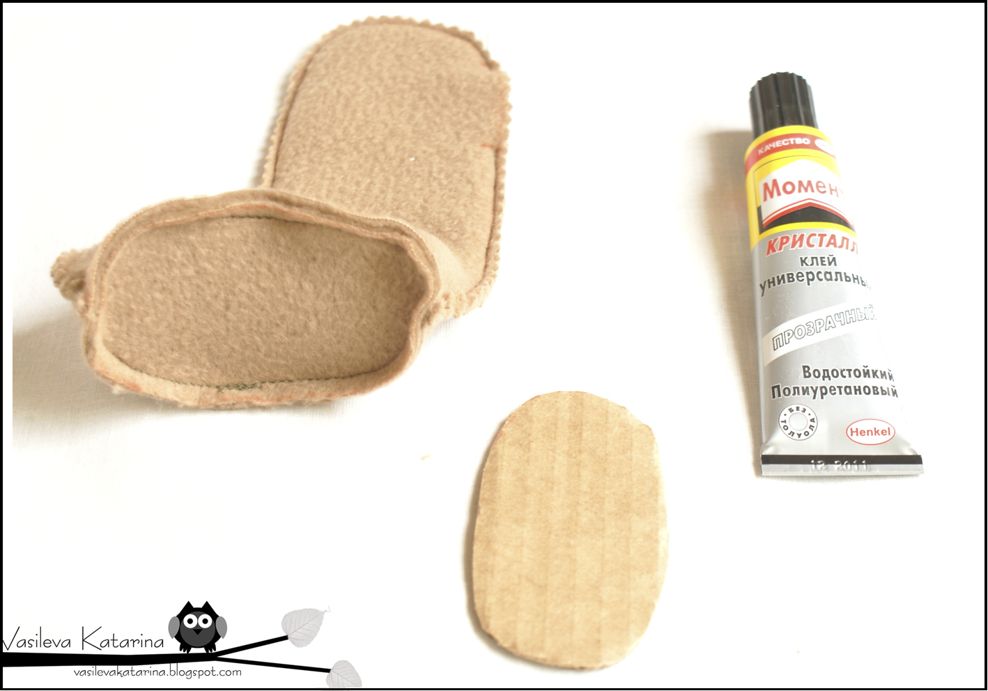 Вырезаем из картона ступню и приклеиваем к ткани клеем( желательно что бы клей был прозрачный)