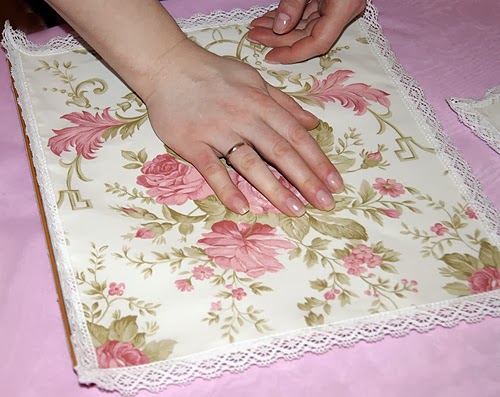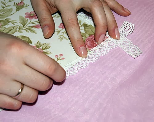 | На получившуюся деталь пришейте кружево. Отмерьте его с запасом по краям около 2 см с каждой стороны и пристрочите по периметру. Для того чтобы красиво прошить уголок, сложите детали лицевой стороной друг к другу и прострочите кружево по диагонали. | Приклейте готовую деталь к обложке. Заготовку для второй |
