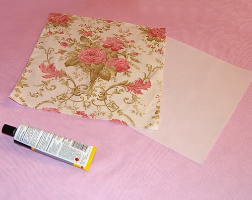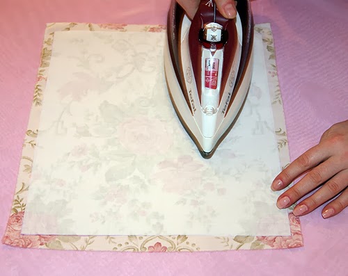 | По такому же принципу обклейте остальные детали альбома. Для оформления форзаца используйте ткань-компаньон. Сделайте две выкройки: одну — из прокламина, на 5 мм меньше размера обложки, вторую — из ткани-компаньона, с припуском в 1 см относительно размера обложки. | На изнаночную сторону ткани положите прокламин клеевой стороной вниз и проутюжьте на максимальной температуре. Разглаживайте деталь по всему периметру в течение 5-7 мин. Припуск загните на изнаночную сторону и не забудьте обрезать уголки и излишки ткани. |
