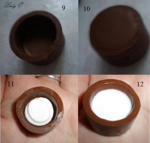 [показать] 9. После запекания вынимаем колпачок. 10. Вид снизу. 11. После запекания вынимаем колпачок. Кладем опять во внутрь начинку (белый пластик или любой другой) и придавливаем колпачком. 12. Вынимаем аккуратно колпачок и кладем к примеру орешек, сделанный ранее (во время этих 5-ти и 10-ти минут). Запекаем 10-15 мин. и получаем эту прелесть))))