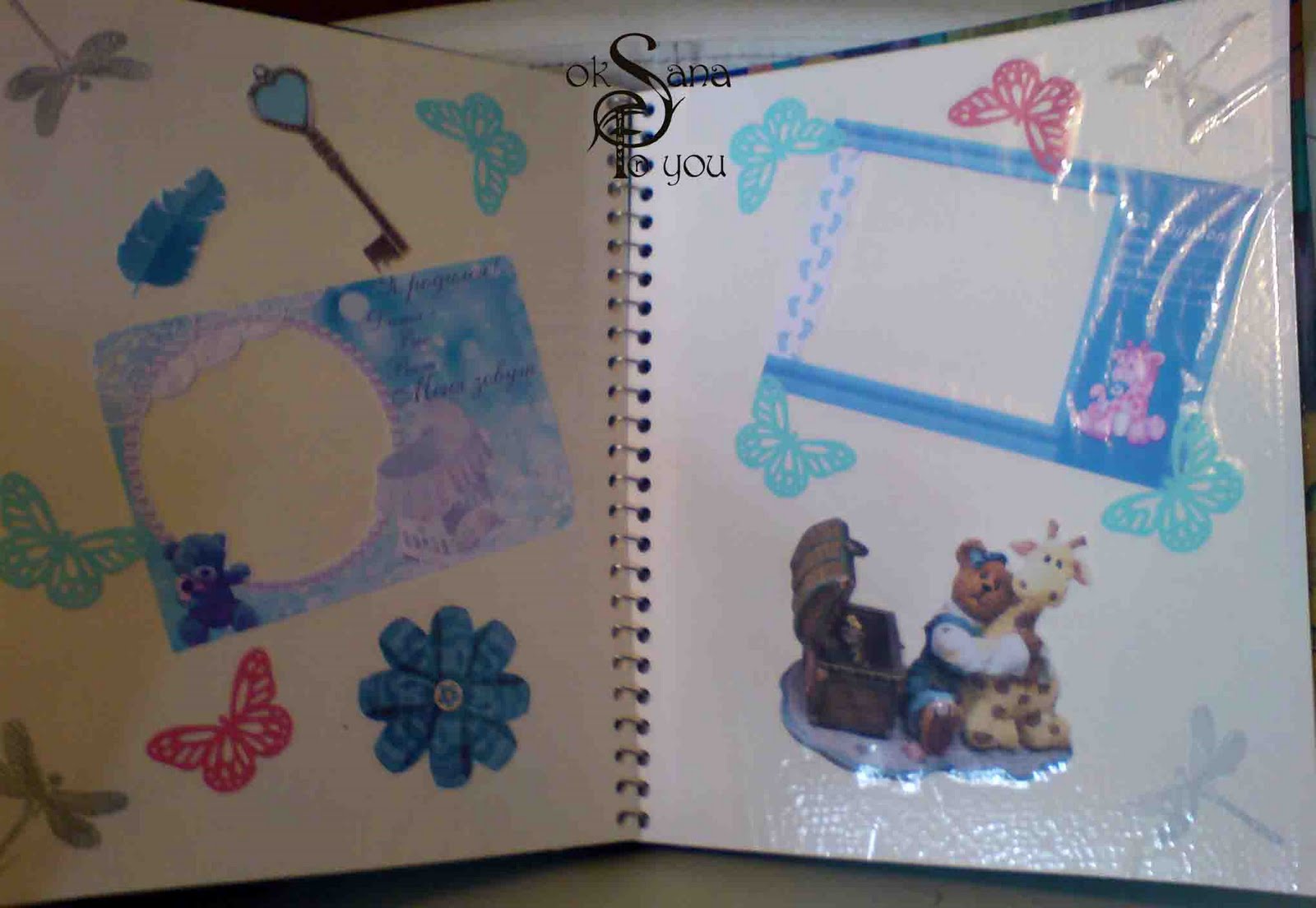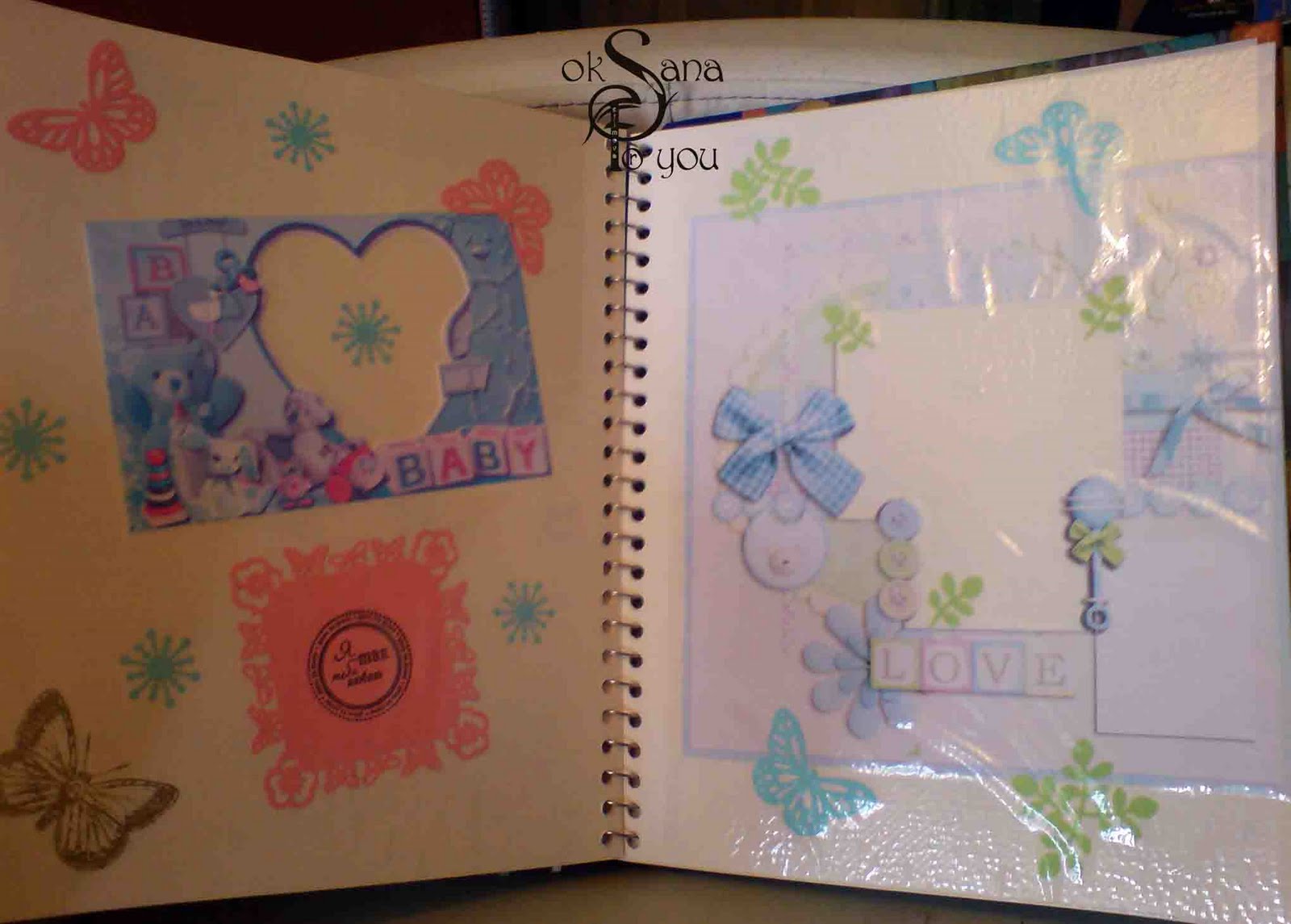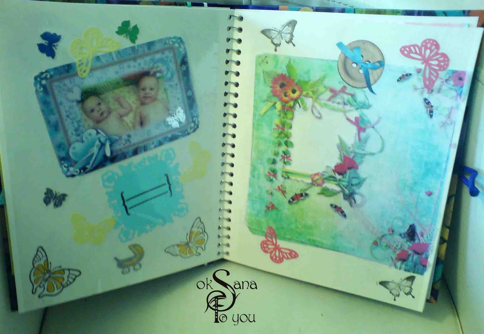 Для украшения белого листа я использовала штампы и дырокольных бабочек, фотографию распечатала вместе с рамочкой обработанной в фотошопе и всё это просто замагнитила прозрачным листом. По тому же принципу сделала и остальные странички :)