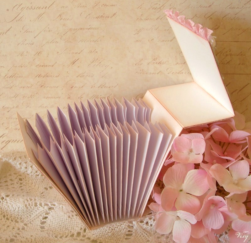 Для создания этого альбома вам понадобятся следующие материалы: 4 листа бумаги для черчения формата А4; 1 лист А4 с отштамповками; ткань для обложки; большой цветок (14,5 см в диаметре); кружевная салфетка; скобка из чипборда; заготовка в виде крыла бабочки; конвертик из кальки; пуговки – 3шт; кусочки ленточки, кружева и шнура; цветы с жемчужным центром – 10 шт; мини-цветочки – 4 шт; 15 половинок жемчужин; картон для обложки; 6 листов двухсторонней бумаги размером 15*30 см; 1 лист розового кардстока размером 15*30 см; 5 листов двухсторонней бумаги размером 15*15 см; дырокольные бабочки; ножницы, нож, линейка металлическая, карандаш; черный маркер. Если у вас нет маркера, то можно использовать ручку или остро заточенный карандаш. Чем тоньше у вас будет стержень, тем аккуратней получится работа; чернила сиреневые для тонировки. Если у вас нет таких чернил, то можно их заменить розовыми чернилами, сиреневым или розовым карандашом, мелками для пастели и в крайнем случае тенями или румянами; клей, объемный (вспененный) скотч; дырокол, чтобы сделать дырки для крепления страничек. В принципе подойдет и офисный.