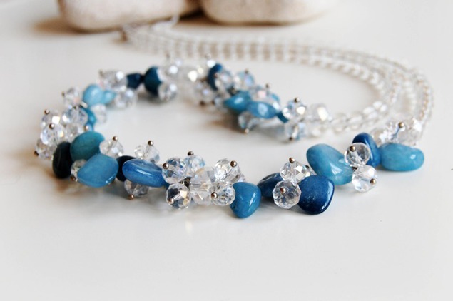 Эффектное вечернее колье из лунника (лунного камня). Придаст изюминку и законченность Вашему образу. Отлично подойдет к вечернему, свадебному или выпускному платью. Очень нежное. Таинственный прозрачный голубоватый цвет лунного камня придает украшению как будто бы внутреннее свечение