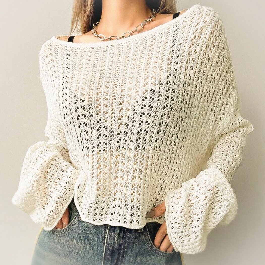Бежевый джемпер из меланжевой пряжи, выполненный мелкораппортным ажурным узором, расположившимся по всей площади деталей.