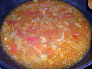 На растительном масле в сковороде слегка обжариваем на среднем огне луковицу, затем прибавляем баклажаны, обжариваем до румяности, прибавляем болгарский перец, обжариваем несколько минут, добавляем помидор и обжариваем, пока он распустится. Или же добавляем 2-3 ложки кетчупа и воду, сразу солим, перчим, сахарим по вкусу, перемешиваем, даём закипеть.