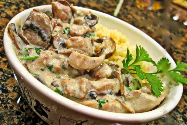 Для приготовления нужно масло оливковое, лук, 1 головка, филе – 400 г. также нужны грибы – 250 г, паста томатная – по вкусу. Добавляется бульон на основе курицы – 200 мл в среднем, сметана – 100 мл.