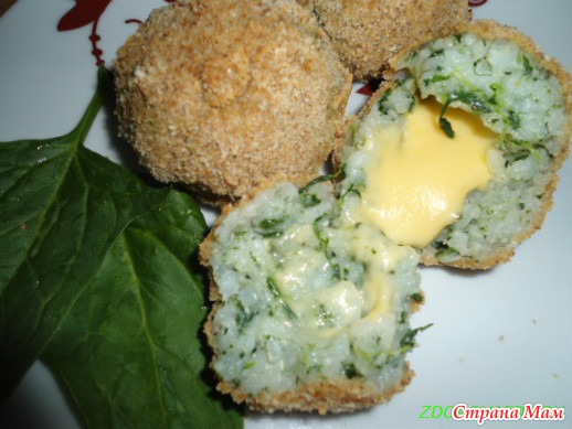 Рецепт от autumn-i: Почему бы нам не приготовить из отварного обычного круглого риса шарики с сыром и не запечь их в духовке? Очень простое блюдо в приготовлении, но получается вкусным и оригинальным. А для того, чтобы шарики получились зелеными - добавить в рис свежий шпинат.