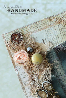 Для данный работы я использовала замечательную скрап-бумагу, тонированную в кофе марлю, элементы-украшения желуди из пенопласта, цветы шелковые, цветы с ленточного кружева (машинная вышивка), косточки от фиников, шпагат, тонированные в кофе штампованные пуговицы, металлическое украшение ножницы, миниатюра стеклянная баночка. Сам конверт-карман наполнила липовым мочалом, веточками березы и веткой-сухоцветом эвкалипта, ну и естественно самим свитком из тонированной в кофе бумаги.