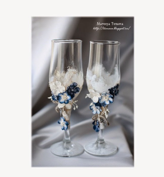 Поскольку свадьба у нас намечалась молочно-синяя, фужеры я сделала именно в этой цветовой гамме.