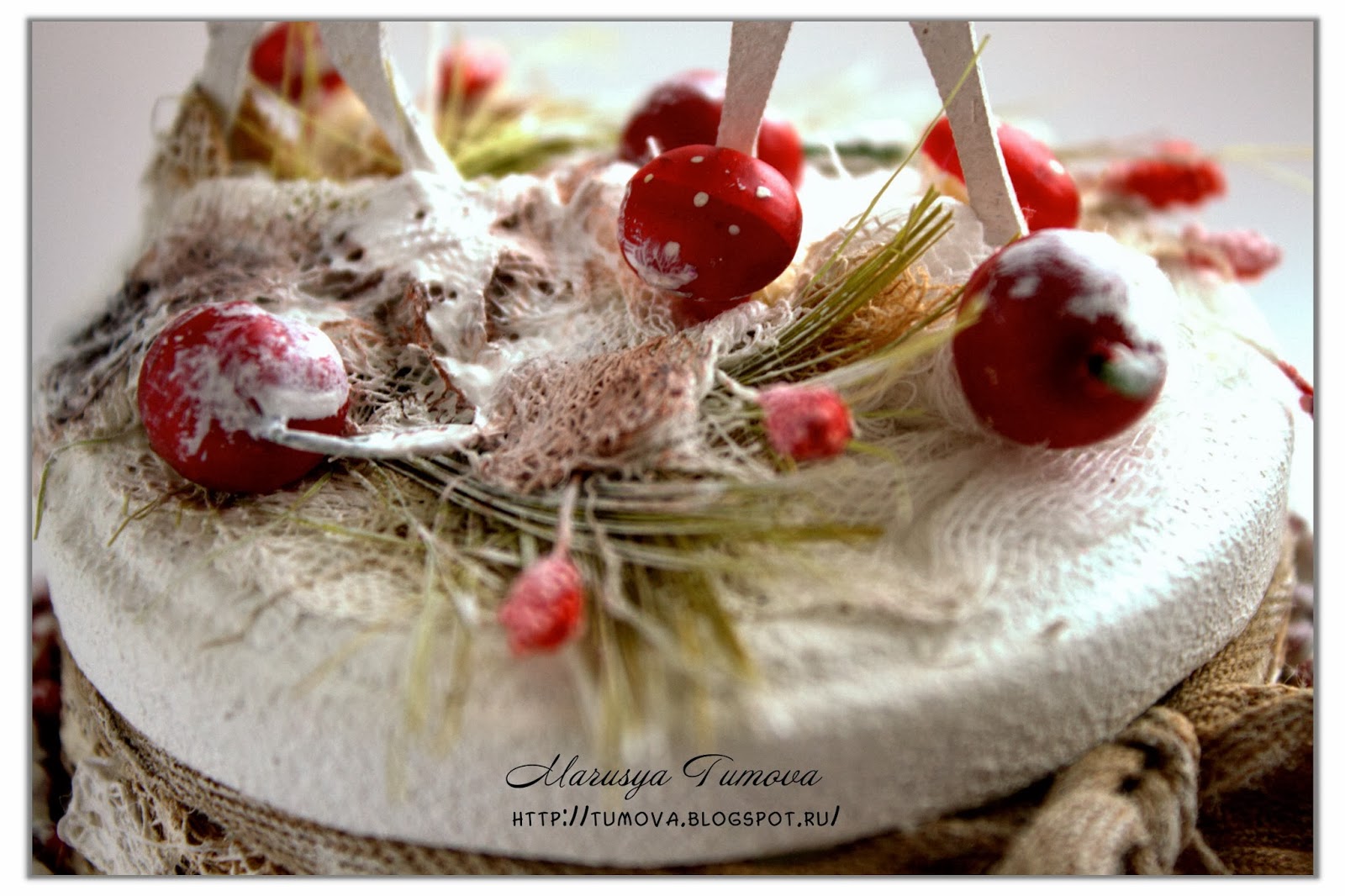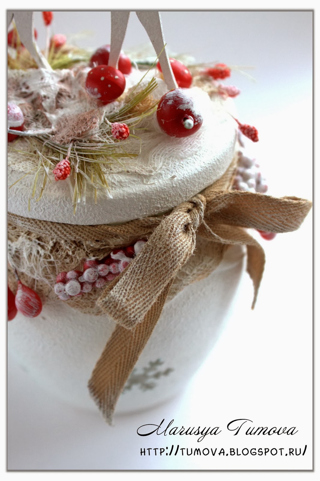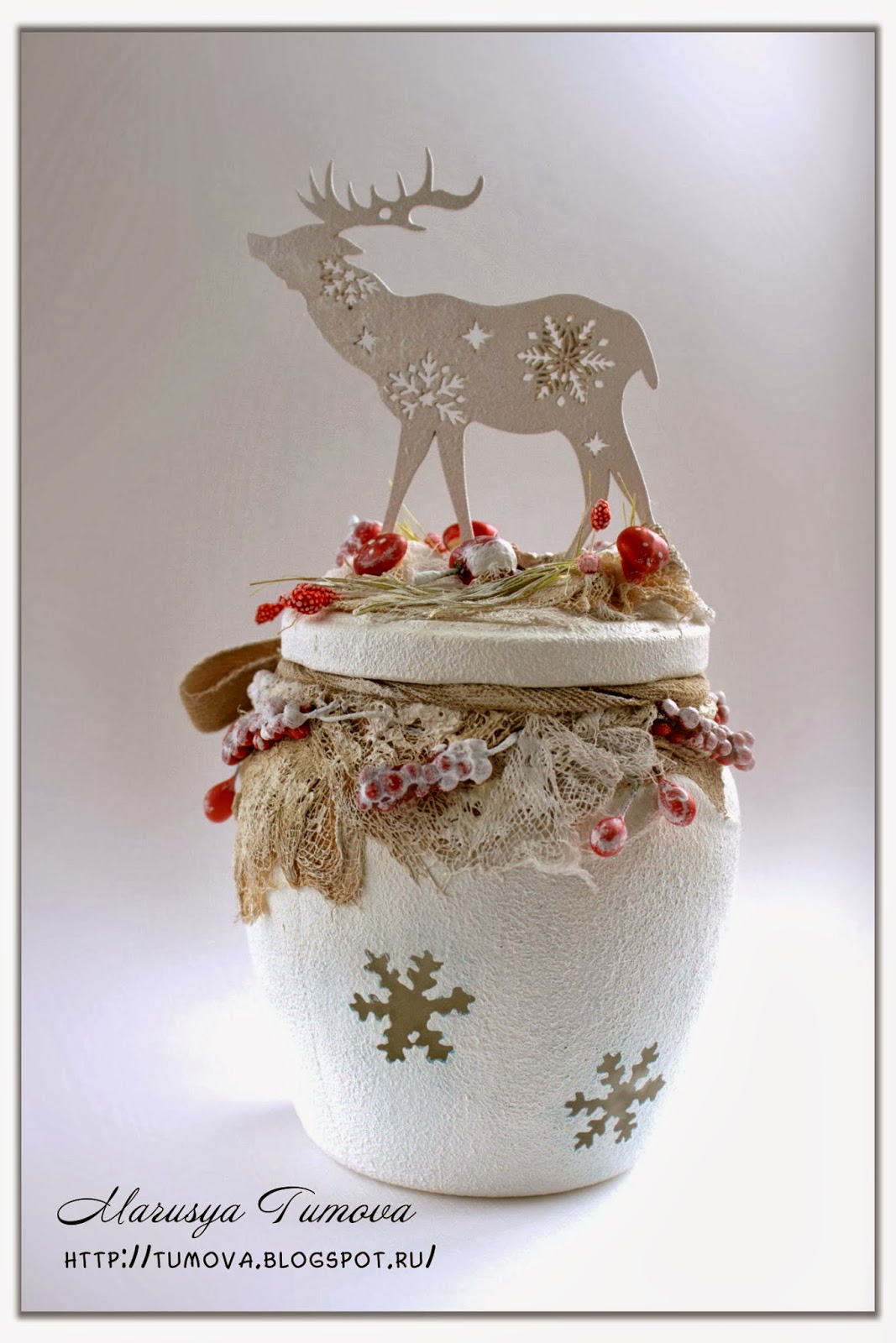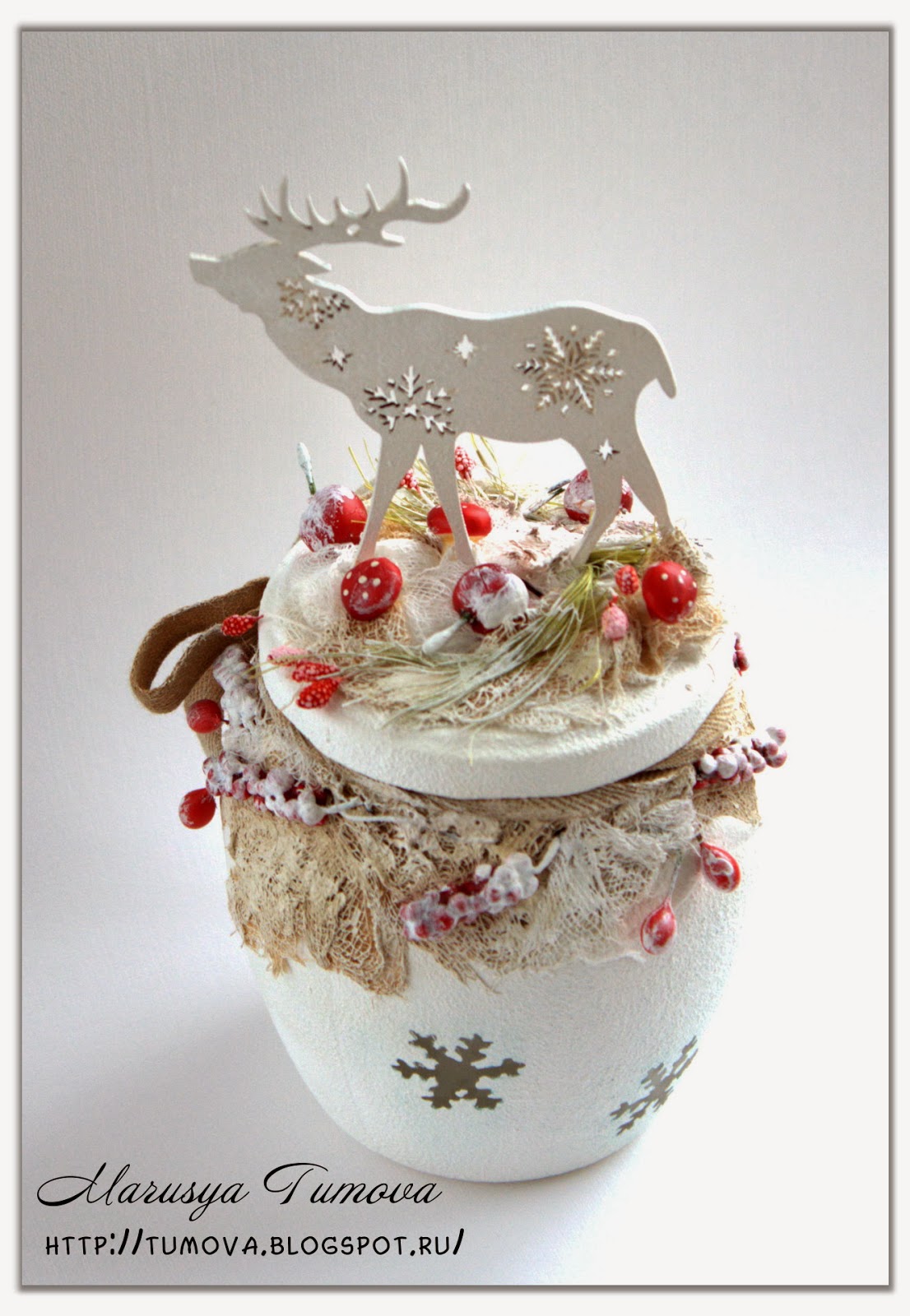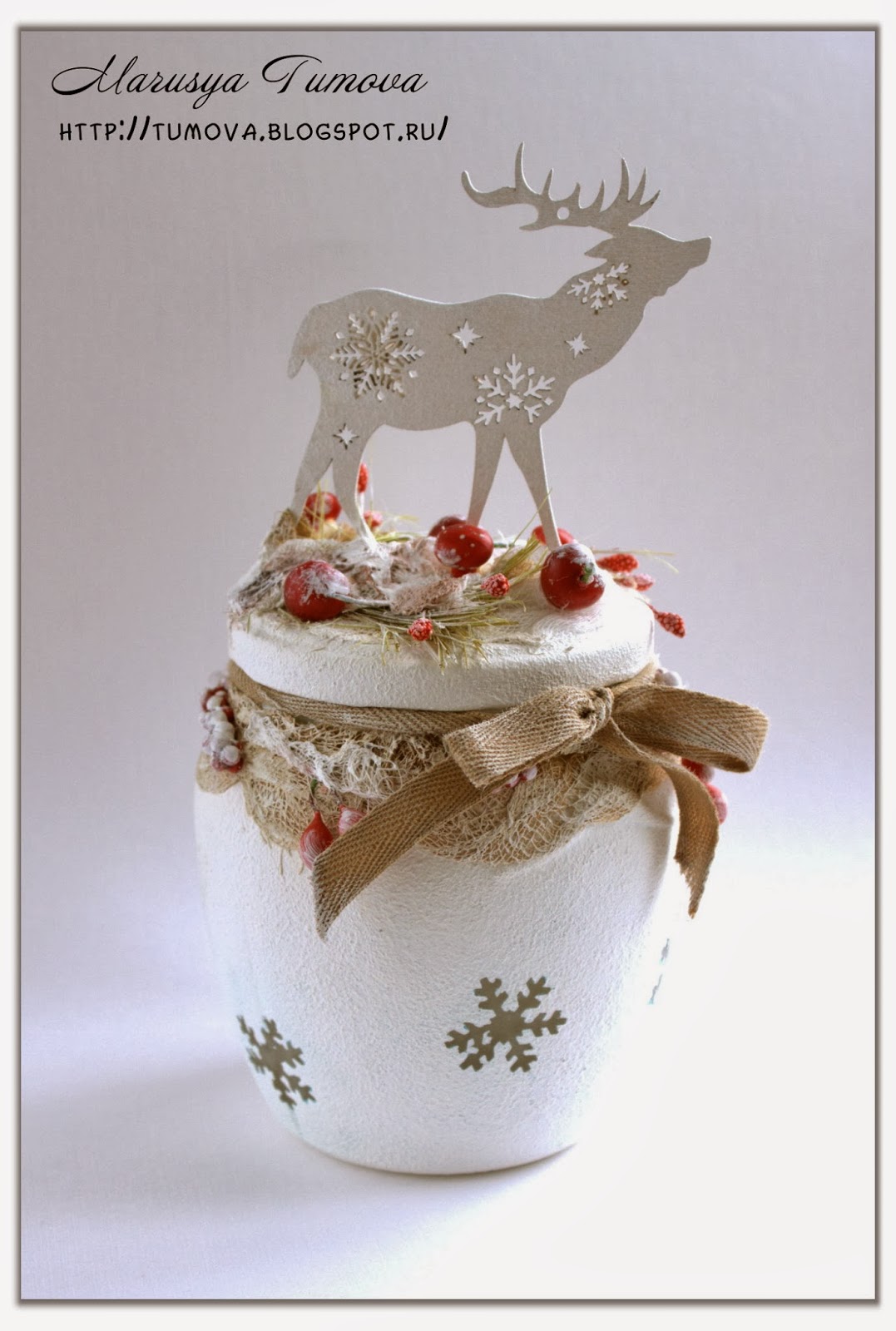 Как-то летом, зайдя к Юле (RoseJam) за заказом, увидела прекрасную крышку на банке, она была с оленями и ягодками, и я просто влюбилась в эту композицию. Решила, что непременно должна сотворить нечто подобное и перед новогодними праздниками реализовала этот образ, который уже очень давно жил в моей голове.