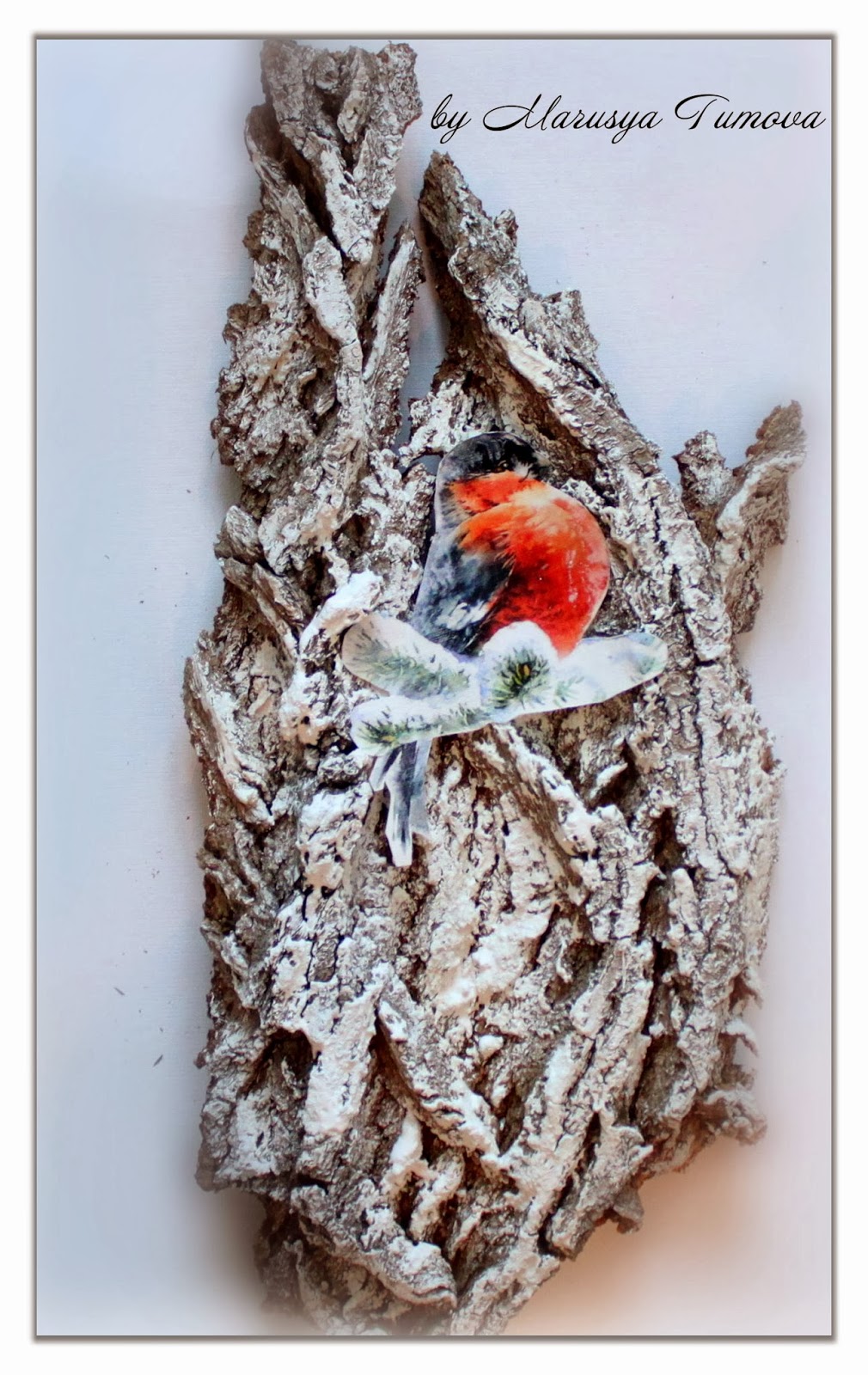 Обычное дело, когда ты думал, что все уже сделано и тебе надо паковать чемоданы для дальнего путешествия, всплывает что-то такое, что ты упустил и не сделал, а делать надо. Так случилось у меня, когда перед самым отъездом в садик Есении сказали принести поделки. В моей голове рождались невообразимые снежные города, гигантские снеговики и сказочные ёлки, но только времени было так мало для реализации моих Наполеоновских планов. На помощь пришла мама, нечаянно ляпнув о том, что у меня на балконе огромные запасы коры из которой я и могу сотворить что-то быстро и красиво. Я внимательно слушала маму и за 20 минут родилось это панно: