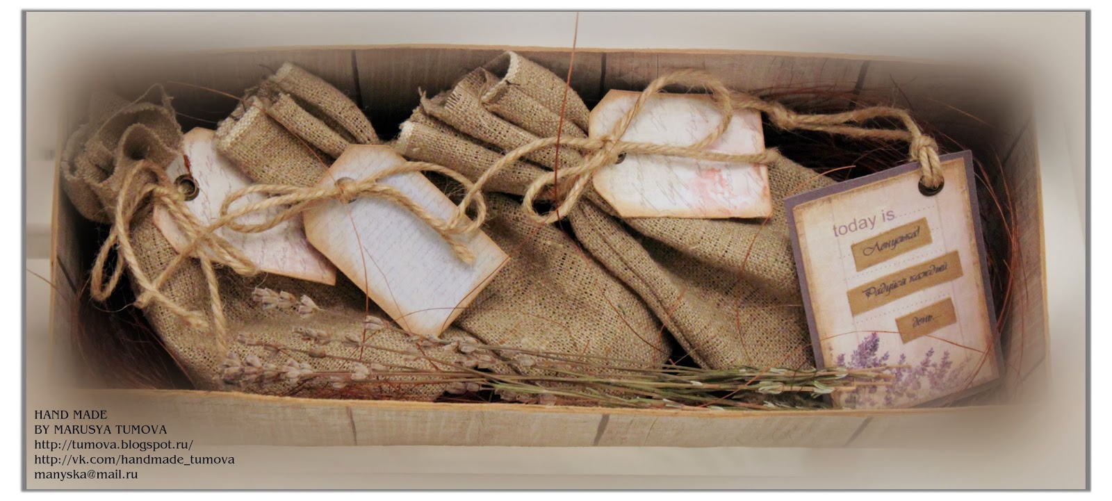 Для самого мыла я сшила такие холщовые мешочки и сделала к ним ярлычки, все положила в коробочку и приукрасила веточками лаванды.