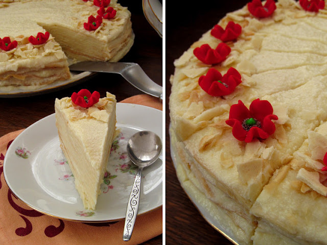 Хочу угостить вас неимоверно вкусным "Наполеоном" с пломбиром!!! Со всей серьезностью заявляю, что вкуснее "Наполеона" я еще не ела!!! И на фоне этого тортика для меня просто меркнут все остальные его аналоги))) Хрупкие и тонюсенькие коржи перемазаны изумительно вкусным кремом, в который добавляется пломбир... это сказка!!! Вкус у тортика настолько нежный, с приятным оттенком пломбира, а структура бархатная, и каждый кусочек просто тает во рту принося вам настоящее наслаждение!!! Единственное, что хочу отметить, это то, что в рецепте количество крема указано так сказать впритык))) Поэтому, для любителей влажных тортов, где много крема, автор рецепта (да и я тоже) рекомендует увеличить норму крема в два раза. Либо уменьшить норму теста в два раза, и сделать небольшой тортик меньшего диаметра. Я делала полторы порции крема, на полную порцию теста, и скажу честно немного пожалела, что не сделала двойную порцию крема))) В следующий раз обязательно будет двойная порция крема, и только так! Уж больно я люблю тортики где много крема))) Но вы конечно ориентируйтесь на свой вкус... И хоть приготовление, а точнее раскатка коржей занимает много времени и сил, но оно того все-же стоит! Рекомендую попробовать!!! Кстати, на вторые сутки тортик становится только вкуснее. И, перед подачей я рекомендую достать тортик из холодильника и подержать немного при комнатной температуре, тогда вы сполна и отчетливее сможете оценить его вкус! Угощайтесь!!!