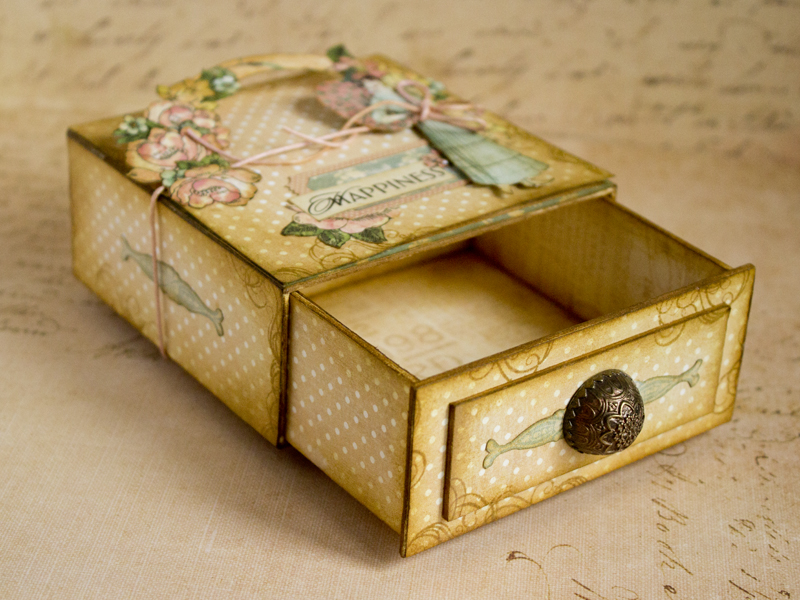 А снаружи все обклеила бумагой и хорошенько затонировала, ведь у меня коробочка в винтажном стиле :)