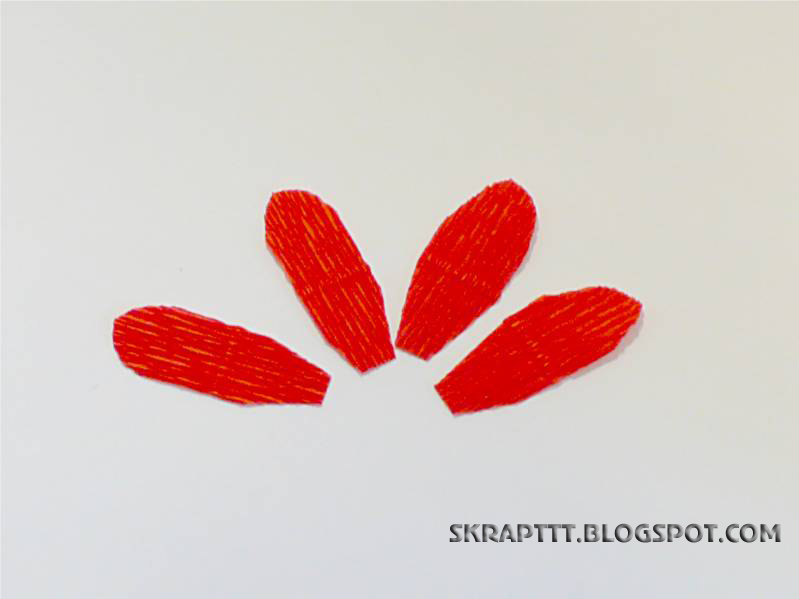 2. Полоску из цветной флористической бумаги перегнем в 4 сложения и вырежем 4 лепестка со скругленным верхним краем и скошенным на угол нижним