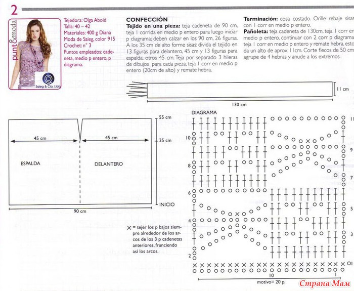 Плотность вязания: 1 повтор раппорта по схеме (= 20 п.) = 7 см, 10 рядов = 10 см.