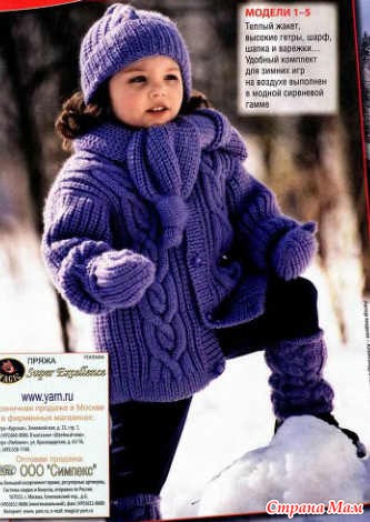 Теплый жакет, высокие гетры, шарф, шапка и варежки. Удобный комплект для зимних игр на воздухе выполнен в модной сиреневой гамме.