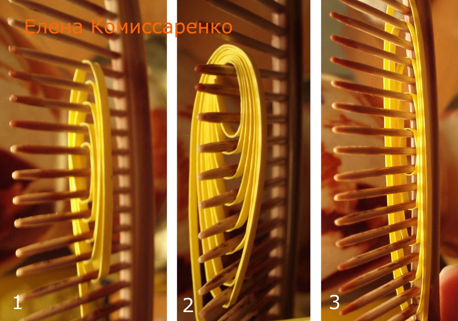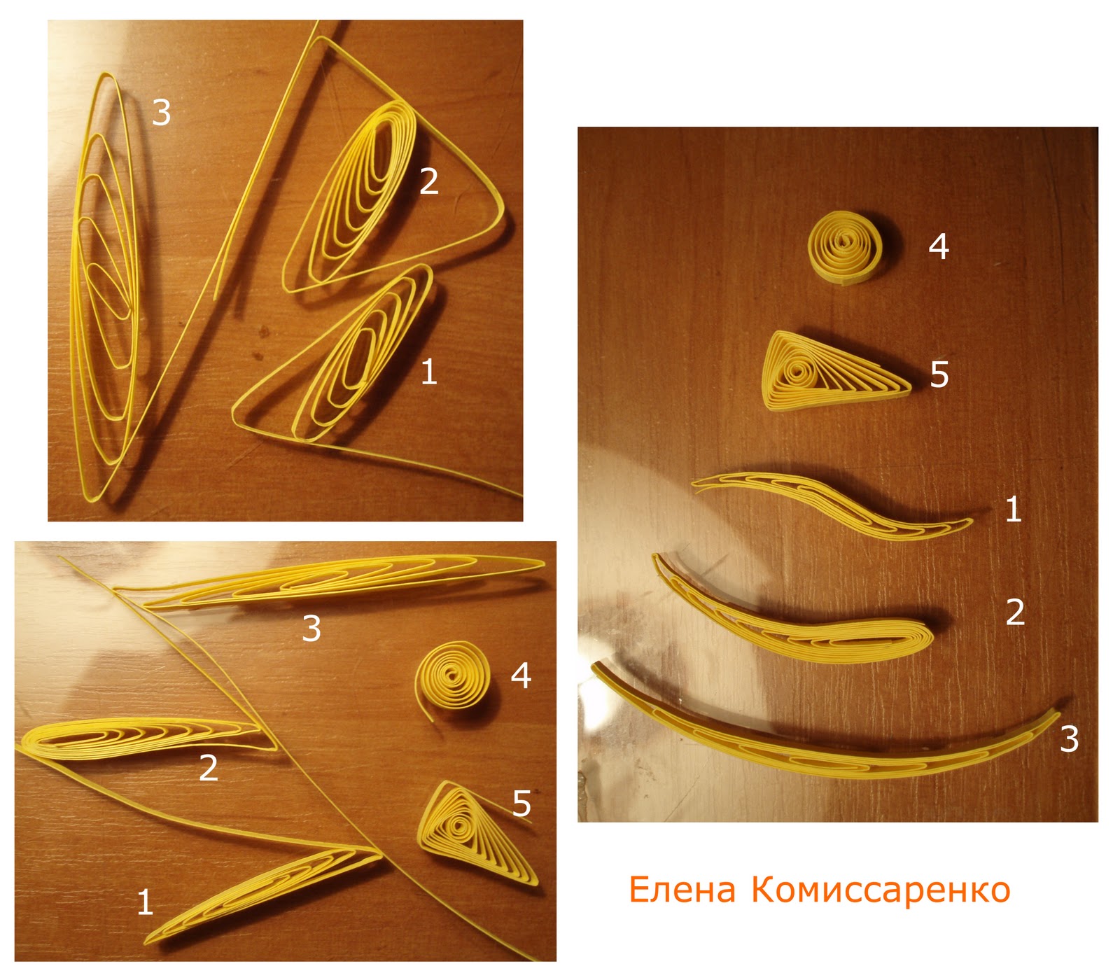 На картинке внизу, то что мы снимаем с расчески, поттом вытягиваем их, примеряем по схеме, придаем окончательную форму и клеим. Кроме этого в работе используются эл. 4 5, сделанные при помощи уже иструмента для квиллинга.
