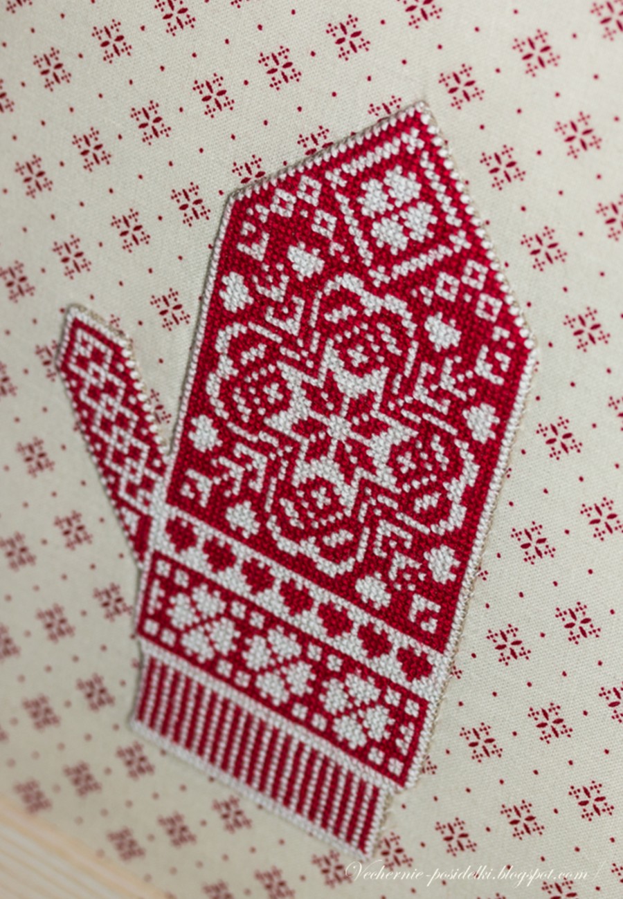 что-то я редко стала вышивать крестиком в последнее время... Но сегодня, наконец, могу показать пусть небольшую, но всё же «крестиковую» работу. Я неравнодушна к норвежским узорам и к норвежским варежкам в особенности, а о таких вот «домиком» вообще мечтаю, так что как только увидела этот дизайн несколько дней назад , сразу начала вышивать.