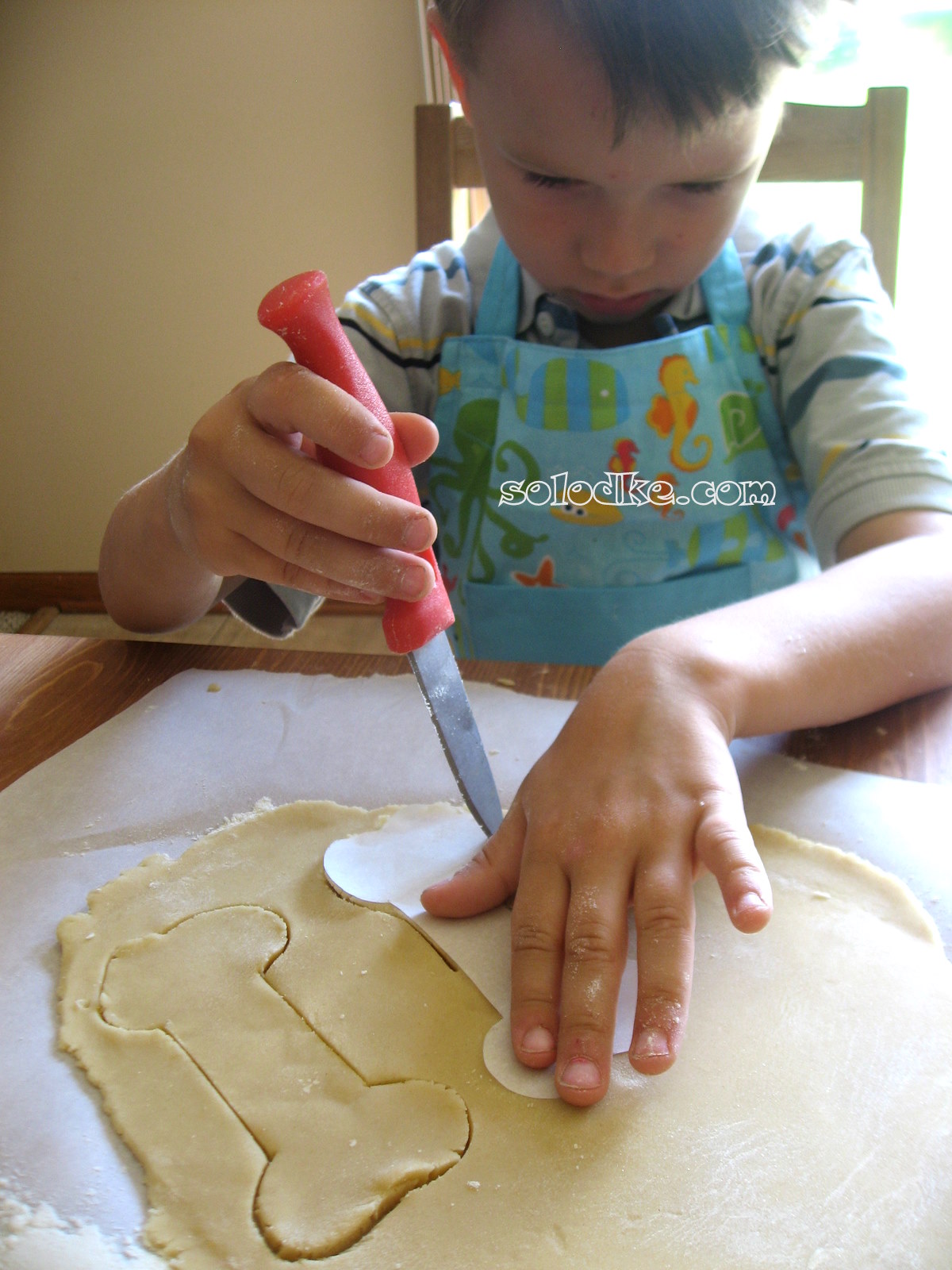 4. Раскатайте тесто толщиной около 1.5 см на слегка посыпанный рабочей поверхности. Используйте формочки в виде косточек или просто нарежьте простыми прямоугольниками. Поместите печенье на пергаменте для выпечки и проткните каждое печенье в центре зубчиком вилки. Выпекайте в течение 20 минут. Переверните и еще допеките в течение 20 минут.