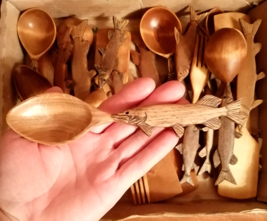Обычно на ложках я насекаю резцом рыбью чешую, а в этот раз этого не делал. Текстура древесины дуба вполне заменяет эту резьбу. Кроме того, не стал и тонировать ложки настоем чаги, чтобы сохранить на черпалах естесственный цвет дуба. Лишь слегка подкрасил сильно разбавленной водной морилкой (цвет орех и эбеновое дерево) рукоятки-рыбки для выделения линий в углубленных местах резьбы.
