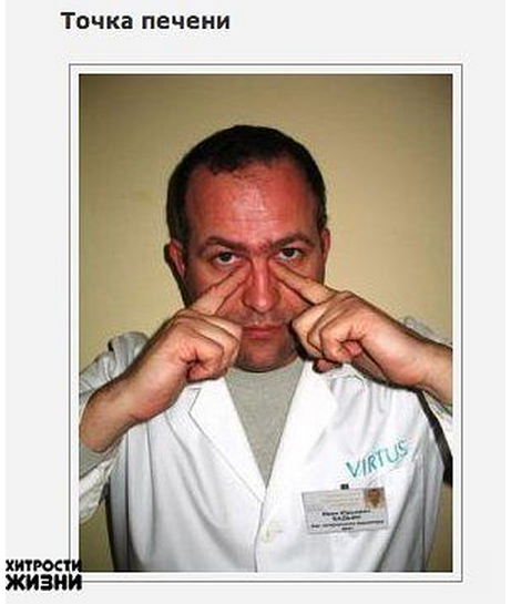 Кроме того, при надавливании на эту точку снижается повышенное внутриглазное давление. Разминать несильными мягкими движениями в течение 2—3 минут (тоже по часовой стрелке и против).