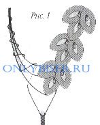 Приготовим 3 низки из коричневого бисера более крупного размера, и одну – из коричневого бисера меньшего размера. Длина трех первых низок определяется расстоянием от шейных позвонков до плеча. Прикрепляем низки к листве, с другой стороны низок крепим застежку (рис. 8).Одиночная низка будет немного большей длины, ей мы будем делать соединительное оплетение предыдущих низок согласно рис.9.