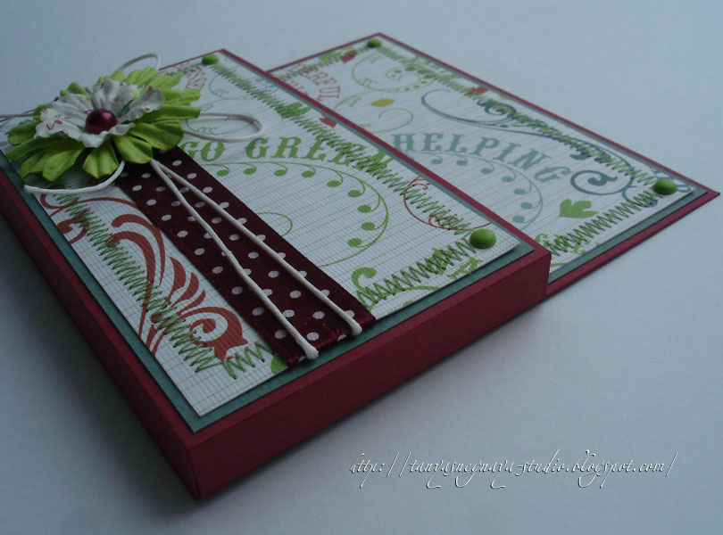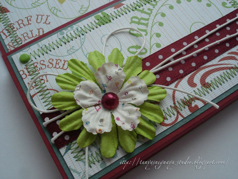 Кардсток, акварельная бумага, два цвета шнура и нитки для отстрочки на выбор, что подойдёт, атласная лента, брадсы и склеенный двойной цветок с полубусиной.