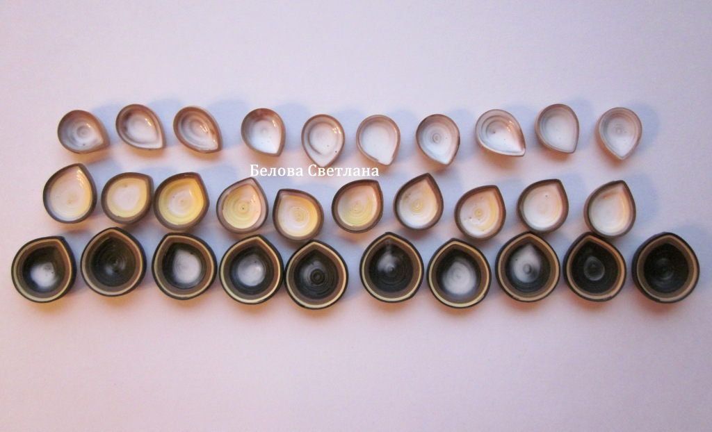 Следующую капельку делаем из пяти полосочек и более светлых оттенков. Тоже 10 штук.