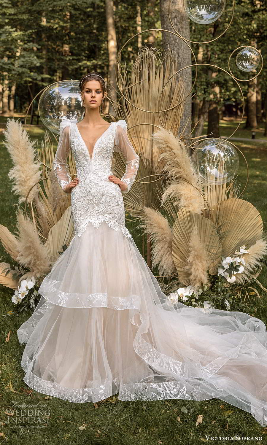 Свадебная коллекция "Звезда Милана" 2020 года наполнена невероятными мечтательными платьями, начиная от бальных платьев с румянами и минималистичных А-силуэтов и заканчивая потрясающе великолепными кружевными футлярами с эффектными верхними юбками. В то время как большинство образов сохраняют романтическую, классическую сказочную атмосферу, многие платья украшены прозрачными элементами, низкой спинкой и глубокими вырезами, что делает эту коллекцию одной из самых сексуальных на сегодняшний день от Victoria Soprano.