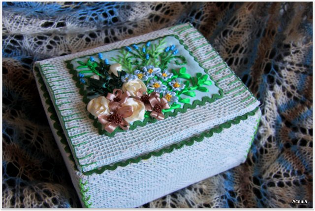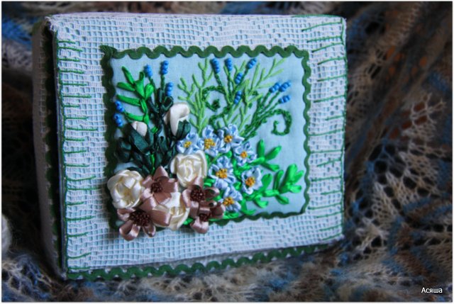 вышито на голубом льне лентами разного размера, бисером, мулине и даже отчасти хлопковой пряжей :) для отделки коробочки использовано винтажненькое кружево из сундука бабушки :) про сундук, я увы, образно, но само кружево правда винтажное :))