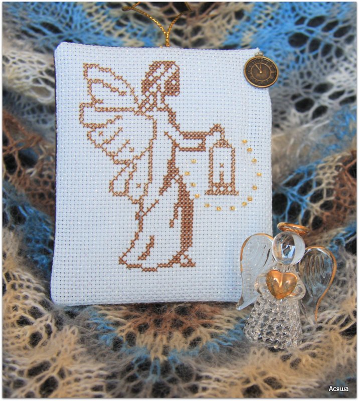 по горячим следам вышилась вторая малютка, она-то точно подойдет в качестве украшения на ёлку, даже маленькую, размерчик всего 5*7 см. А вот первый Ангел большой, 10*12 см, его можно прикрепить куда-то на шкаф, например :) в общем, я уверена, что в украшении интерьера к Рождеству, он тоже найдет своё место в новом доме :)