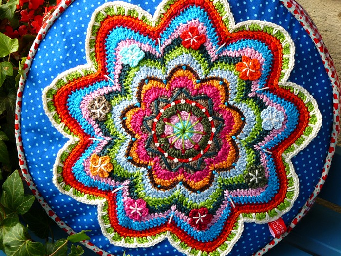Есть подушки полностью вязаные крючком. Некоторые подушки сшиты из ткани и дополнены вязаными цветами и вышивкой. Изнаночную сторону подушек украшает красивая застёжка.