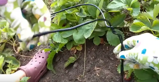 После чего наденьте получившуюся резинку на часть куста, поднимая от земли листву и ягоду, затем сделайте перекрест и обвяжите аналогичным образом вторую часть куста.