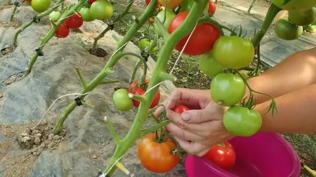 Два главных элемента на налив плода (чтобы томат не растрескался, оставался упругим, сочным, сладким) — это калий и кальций. Подойдут любые удобрения с данными элементами, кроме кальциевой селитры — так как в ней есть азот, который уже не нужен растению. После них уже идёт магний + фосфор (монофосфат калия, подкормка под корень — 2 гр. под 1 куст), а также бор. Бор необходим для того, чтобы растение продолжало завязывать плоды даже после третьей кисти. Для этого раз в месяц должна быть обработка удобрением, например, «Маг-бор». Внесите все необходимые элементы, чтобы томат продолжал радовать вас отличным урожаем! Также не забудьте удалить нижние листья там, где томаты уже начали буреть.